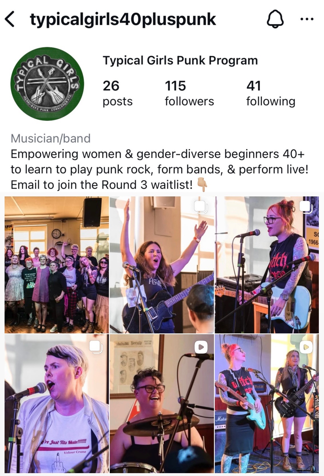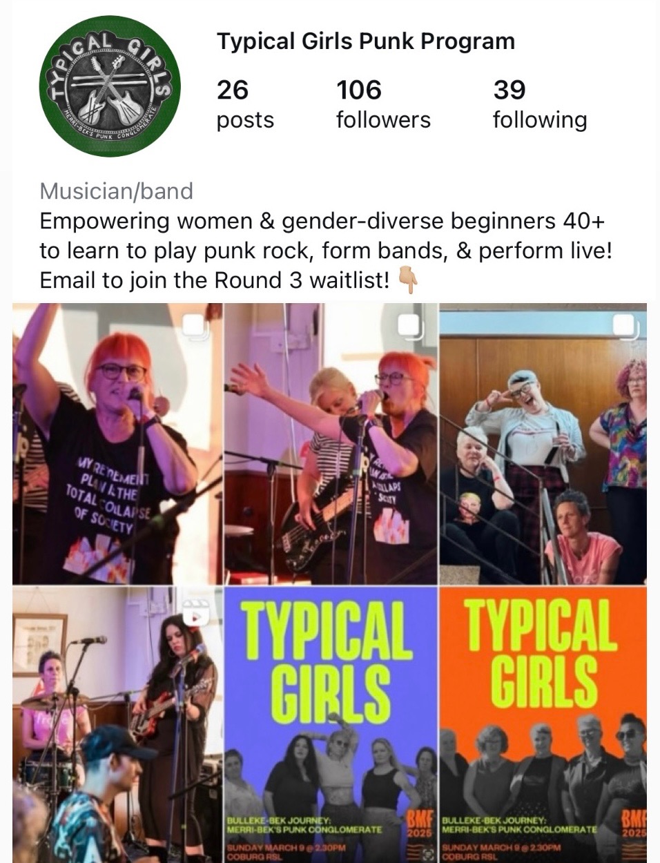 The program had no social media presence when I joined, so I took the initiative to create and manage its Instagram and Facebook pages. I suggested renaming it from the ‘Merri-Bek Typical Girls Punk Conglomerate’ to the ‘Typical Girls Punk Program’, and came up with the handle @typicalgirls40pluspunk