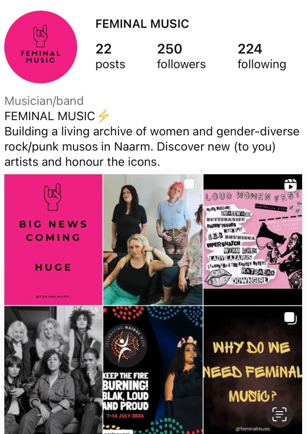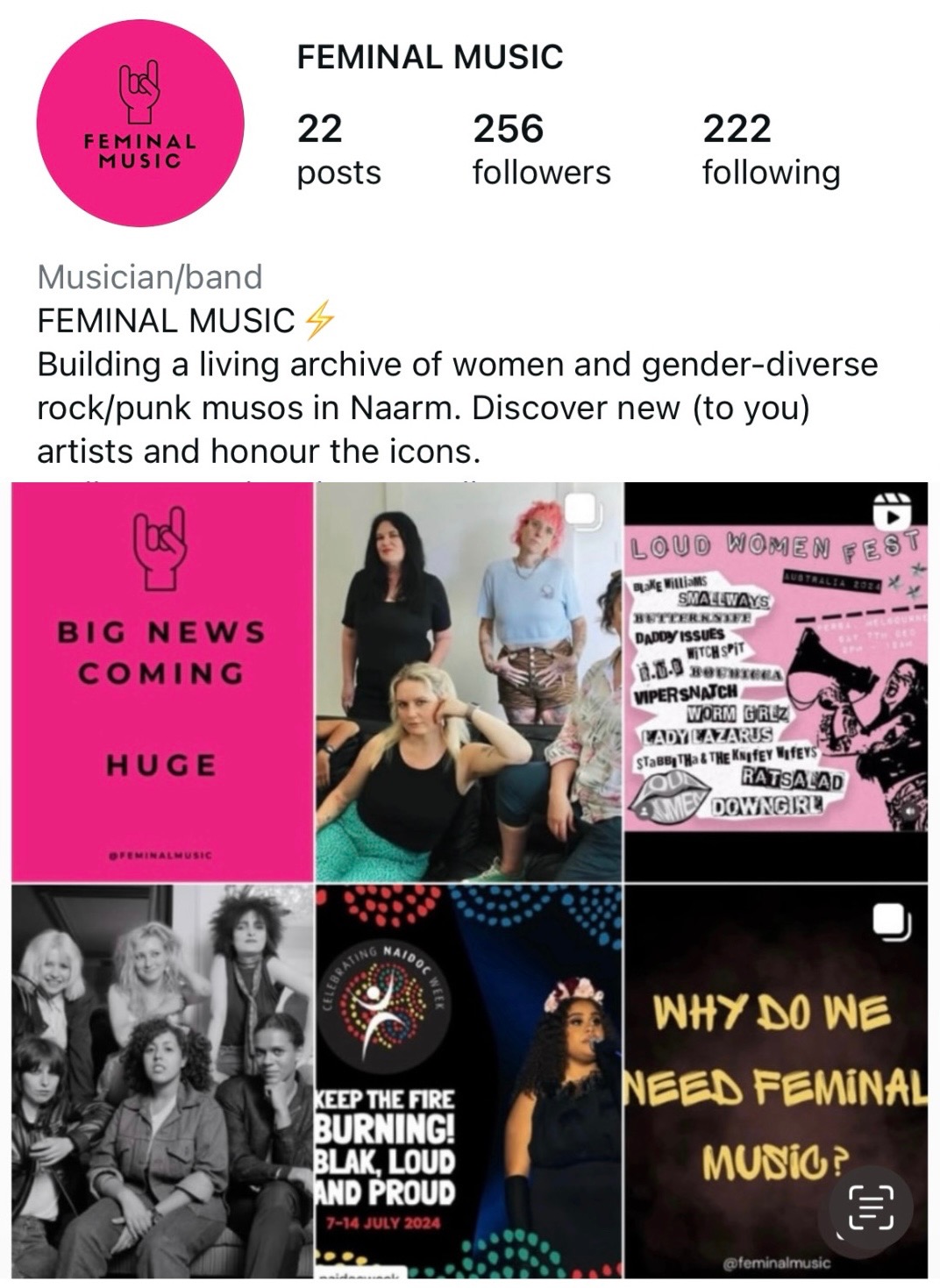 FEMINAL MUSIC is a personal project designed to create a living archive of women and gender-diverse musicians in Naarm/Melbourne.